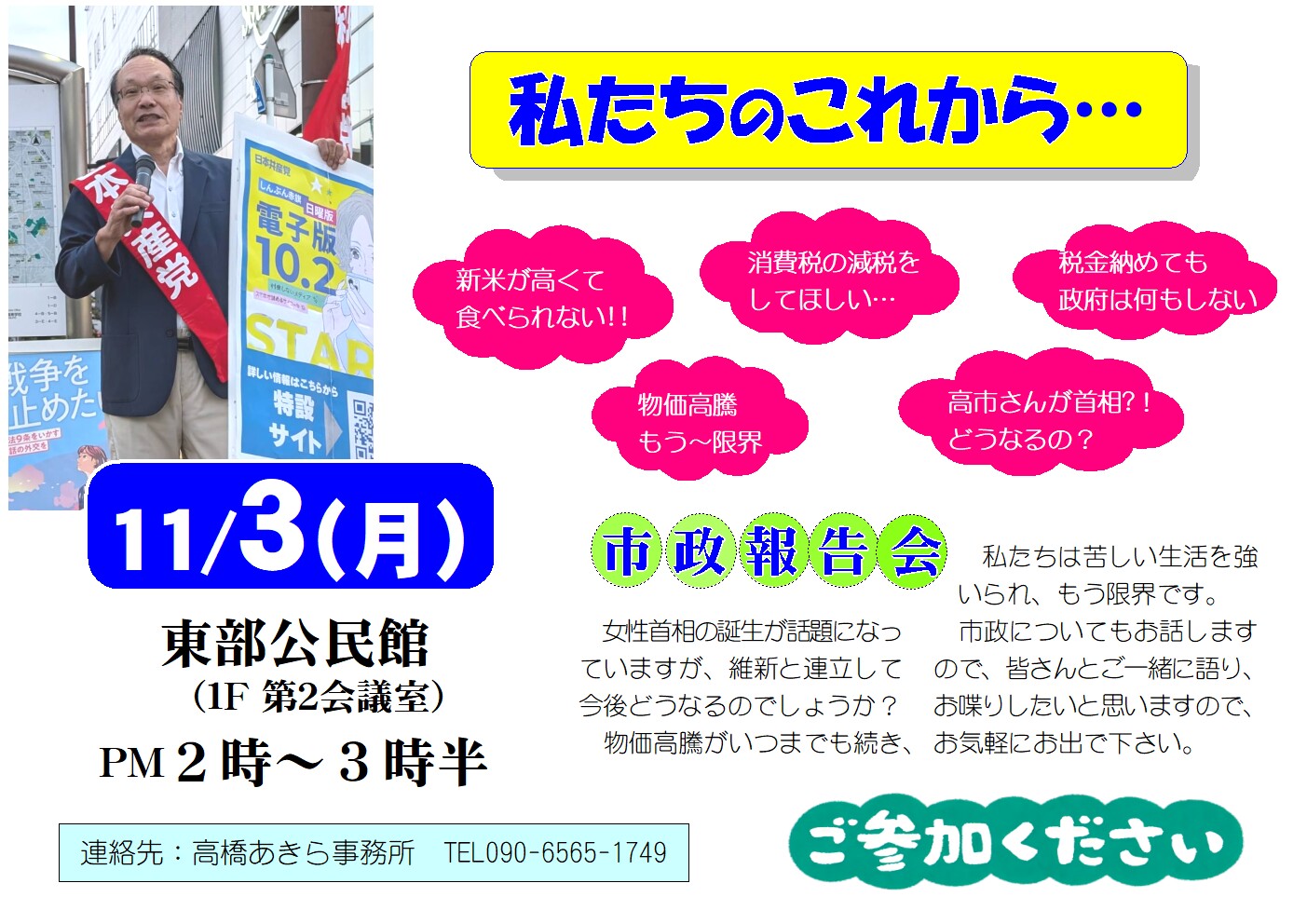 物価高騰がいつまでも続き、 私たちは苦しい生活を強いられ、もう限界です。市政についてもお話しますので、皆さんとご一緒に語り、お喋りしたいと思いますので、お気軽にお出で下さい。